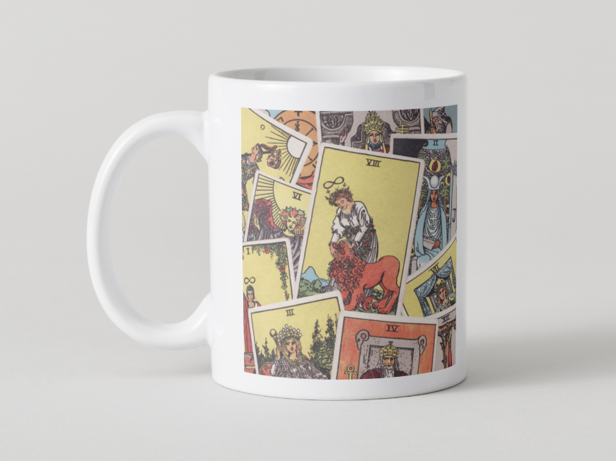 筆者はこちらにいと引かれまして、パメラ・コールマン・スミス女史へのリスペクト120%で今回マグカップを作成させていただくに至りました。TaionWC氏による22枚の大アルカナのPD画像を、表面に11枚、裏面に11枚、古びた原画の風合いそのままに、無加工にて、もれなくしっかりコラージュさせていただいた次第です。